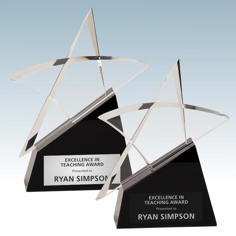 Our Premier Star Crystal is handmade and may vary slightly in size. Clear optic crystal outline star mounted to black crystal base. Packaged individually in a lined gift box. Choose Premier Crystal to honor rising stars!